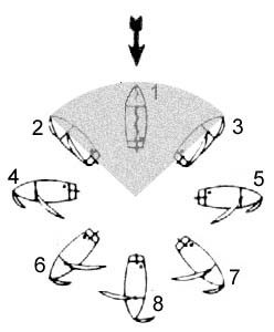 Zoals je ziet kan je met een zeilboot 8 verschillende koersen varen. Hieronder heb ik de koersen namen gegeven.