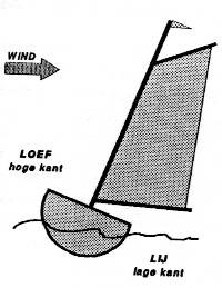 Ook de begrippen die in dit plaatje zijn weergegeven zijn heel makkelijk. De loefzijde is de hoge kant van de boot, de lijzijde de lage kant.