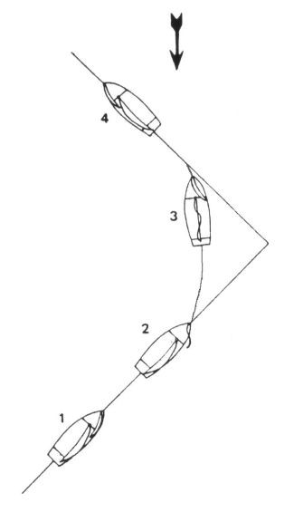 In het plaatje hierboven is aangegeven hoe een overstag manoeuvre eruit ziet. Dit is de overstag manoeuvre van aan de wind met het zeil over stuurboord naar aan de wind met het zeil over bakboord. De overstag manoeuvre met de zeilen eerst over bakboord ziet er uiteraard precies hetzelfde uit, alleen verticaal gespiegeld.
